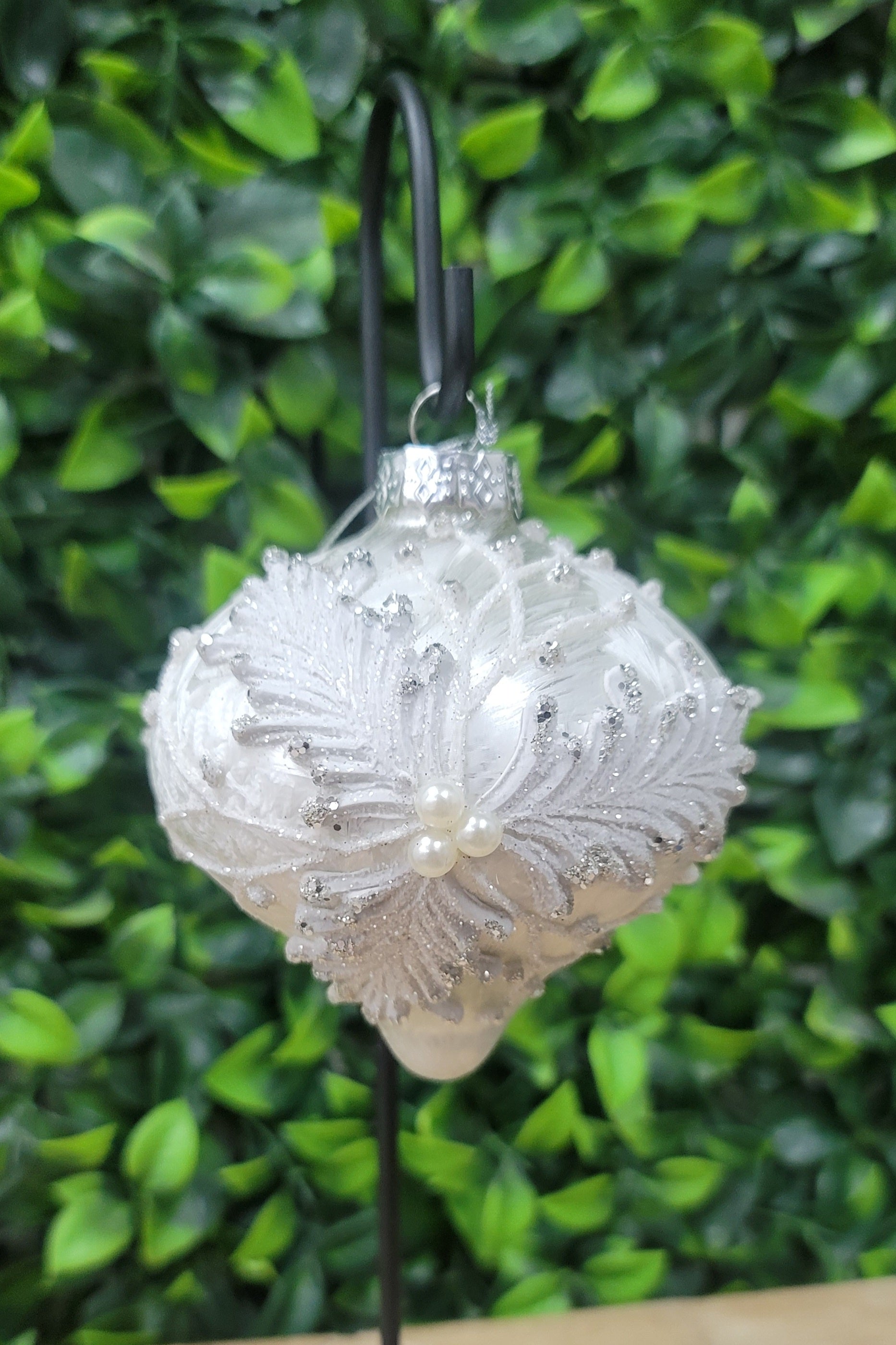 Gorgeous white glass ornament, detailed with pearls, dusted with white and sliver glitter. Approximately 4".