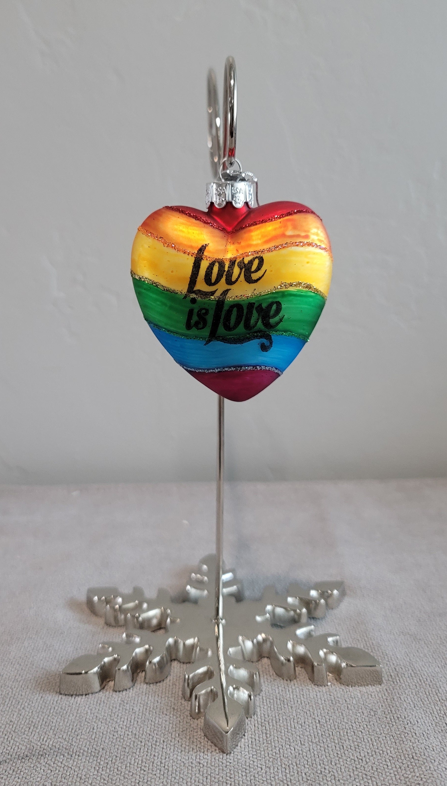 Beautiful LOVE IS LOVE water colored heart shaped glass ornament measures at about 4".